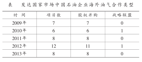①合作目的不同。我国石油企业海外油气开发合作经历了几个阶段,各阶段的合作目的呈现出不同特点。我国石油企业开展海外石油合作的根本性原因在于获取石油资源,尤其在初期体现得极为明显。随着海外产油国对于本国资源的开发管理,我国石油企业凭借自身劳动力优势,以学习技术和取得石油资源为目的参与国际石油企业的开发项目,并且逐步在非洲工业基础较薄弱地区和中东政局不稳定地区开展油气合作。现阶段海外油气合作的火热进行,除了自身对于油气资源的渴求,我国石油企业也在寻求更大的海外油气市场,寻求更好的发展前途。 ②合作形式不同。我国石油企业与传统产油国的合作更多地采用战略联盟,少数股权并购也是建立在独资的基础上,这也就导致了在敏感的国际油气市场上,很多合作项目的夭折。而现阶段,我国石油企业在发达国家的油气合作则更多的是通过参与国际石油企业的大项目合作,采取股权并购的模式,辅以战略联盟(见下表),且股权较小,这为我国石油企业进入发达国家市场带来了契机。