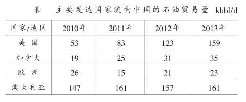 在双重因素的推动下,我国石油企业积极与发达国家开展油气开发合作,截至2013年,主要发达国家流向中国的石油贸易量不断增加。下表给出了近年主要发达国家流向中国的石油贸易量。
