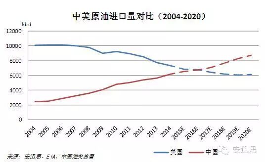 海关数据显示,中国今年4月原油日均进口量再创新高,且单月首次超越美国。据安迅思分析,中美在原油进口量上出现典型的剪刀差,未来随着中国对外依存度加大而美国自给率提高,中国将在2017年全面超越美国,稳坐原油进口老大。市场分析人士表示,随着中国的购买量增大,产油国的战略也全面东移。