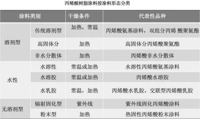 按丙烯酸树脂聚合物的形态和性质分为三种:溶剂型、水型、无溶剂型。