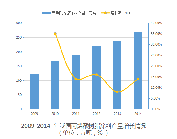 根据前瞻调研整理,目前我国丙烯酸树脂涂料产量占涂料工业总量的比重持续上升,2014 年我国丙烯酸树脂涂料产量269 万吨,同比增长14.2%。