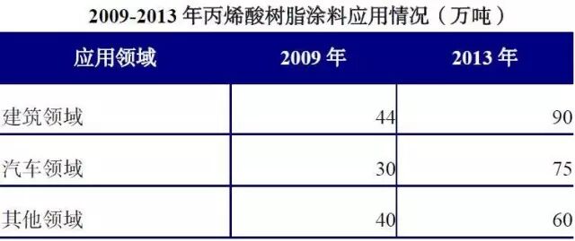 丙烯酸树脂在国内工业涂料中用量最大的是交通车辆。2013 年汽车涂料达130 万吨左右,其中汽车OEM 涂料87 万吨,其中60%左右是丙烯酸涂料,丙烯酸氨基涂料占多数;汽车修补漆43万吨,20 多万吨是丙烯酸-聚氨酯涂料。火车、船舶、桥梁、家电、卷材、钢卷尺、水泥漆、钢结构防腐漆、木漆等也大量使用丙烯酸树脂涂料,粗略估计,丙烯酸树脂系涂料在这些领域中用量至少在60 万吨以上。