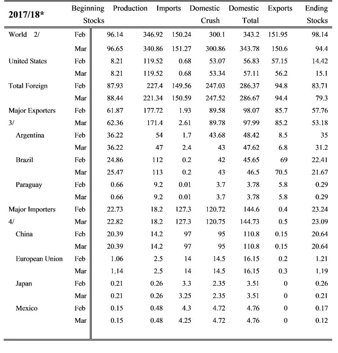 基准判断:由于大豆市场中美进出口依赖度太高,我们目前认为当前中美两国都不会使用大豆作为贸易战的工具,这个工具杀伤力太大了!无论是对于美国农民,美国出口经济,还是中国的进口需求。 全球大豆平衡表(USDA3月)