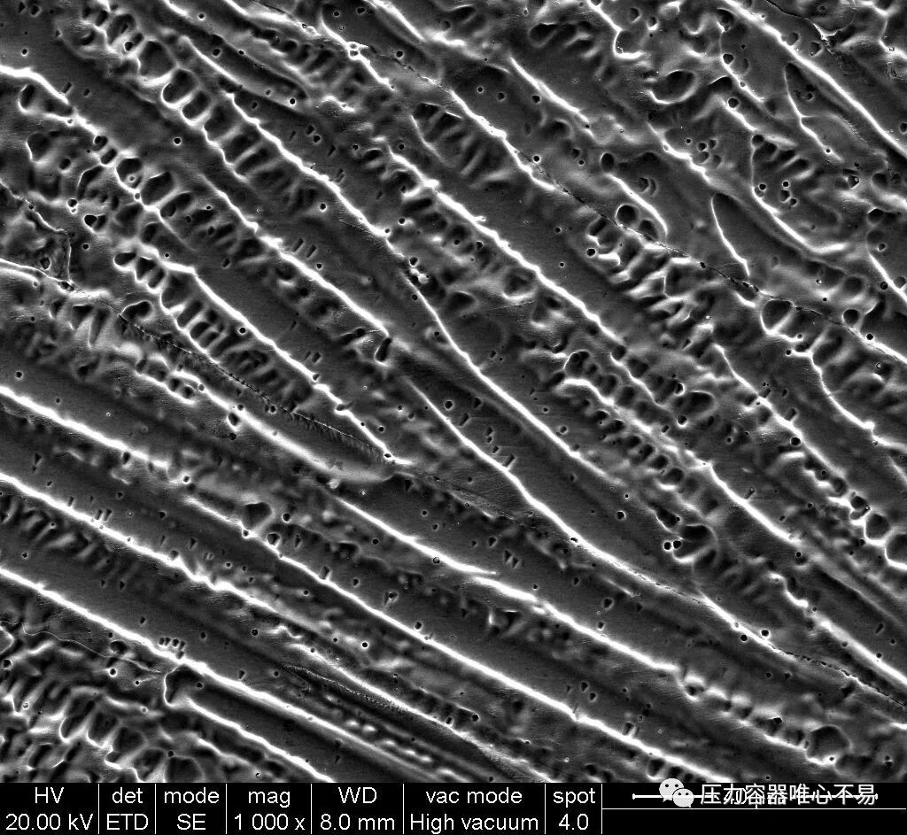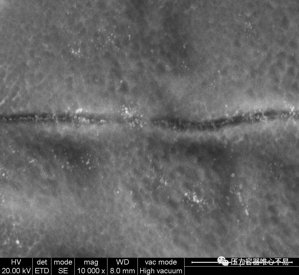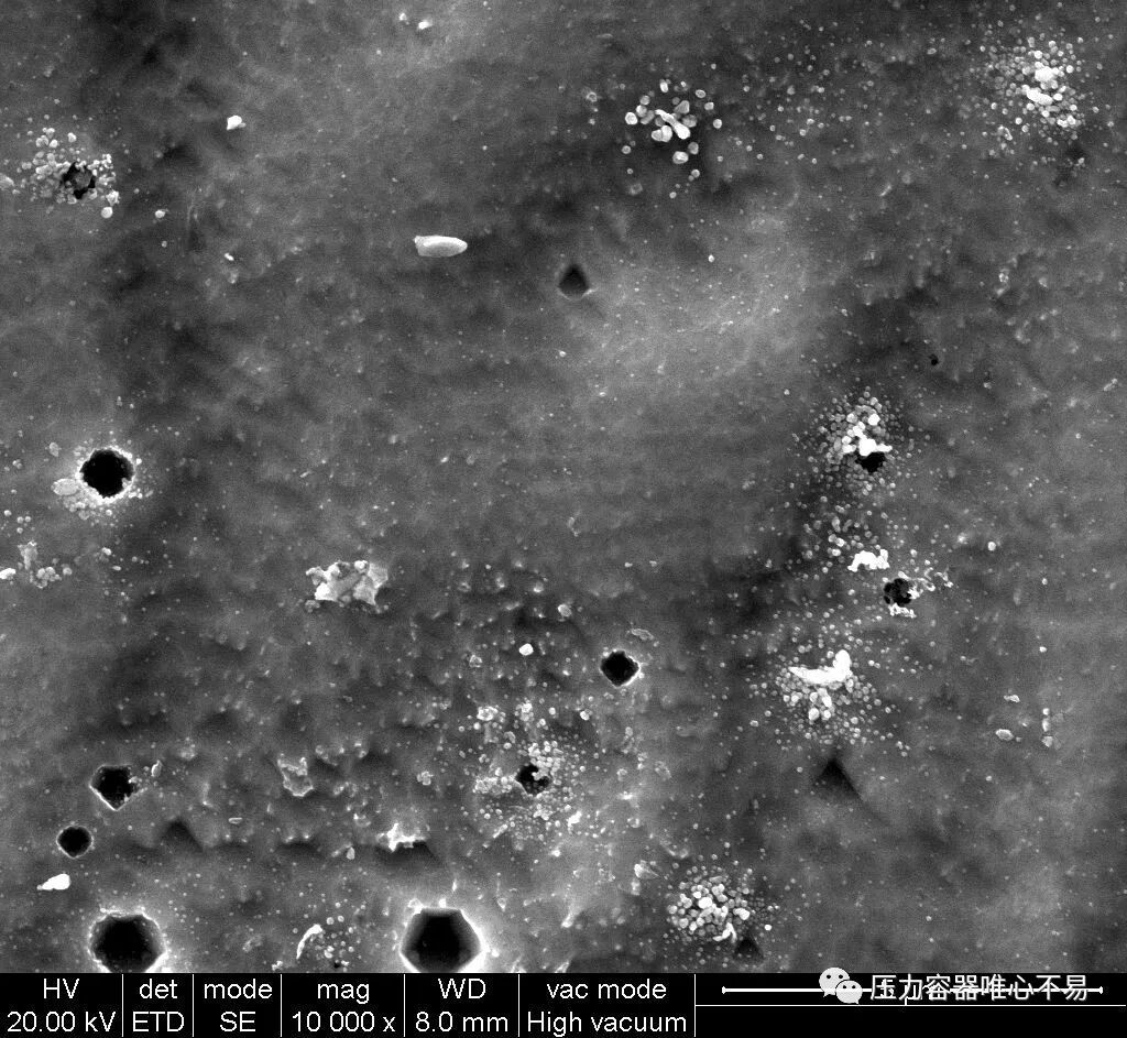 从1000倍的放大倍数来看,在焊缝金属中几乎看不到第二相析出物。进一步放大到10000倍以后,也只在视场内找到极个别尺寸非常微小的白色析出物。