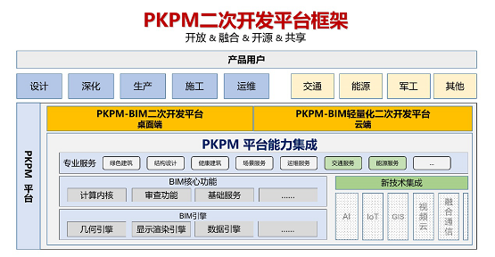 PKPM-BIM 二次开发平台框架 近年来,我国建筑业保持稳定发展,国家正在推动建筑业向信息化、数字化转型,根据《建筑业发展“十三五”规划》要求,加快推进建筑信息模型(BIM)技术在规划、工程勘察设计、施工和运营维护全过程的集成应用,支持基于具有自主知识产权三维图形平台的国产BIM软件的研发和推广使用。 目前,国内主要应用的BIM软件和系统基本都是国外BIM软件和在国外BIM软件上二次开发的插件,国产自主BIM软件比较缺乏。 近年来,构力科技坚持自主创新,攻关底层核心技术,先后研发了自主PKPM-BIM平台和构力云平台,在PKPM-BIM平台上研发的建筑工业化系列软件、BIM系列软件和BIM协同解决方案,促进了建筑工业化和BIM产业的健康发展,以建筑行业应用为基础,在国内建筑企业和政府部门都得到了广泛应用。 这些产品在市场推广和应用取得初步成功后,我们为行业提供了平台二次开发包,开放PKPM图形平台技术、专业平台技术、数据格式,提供培训和服务,希望有更多的合作伙伴能更容易的开发出优秀的软件产品,形成国产BIM软件的生态环境。部分典型案例如下: