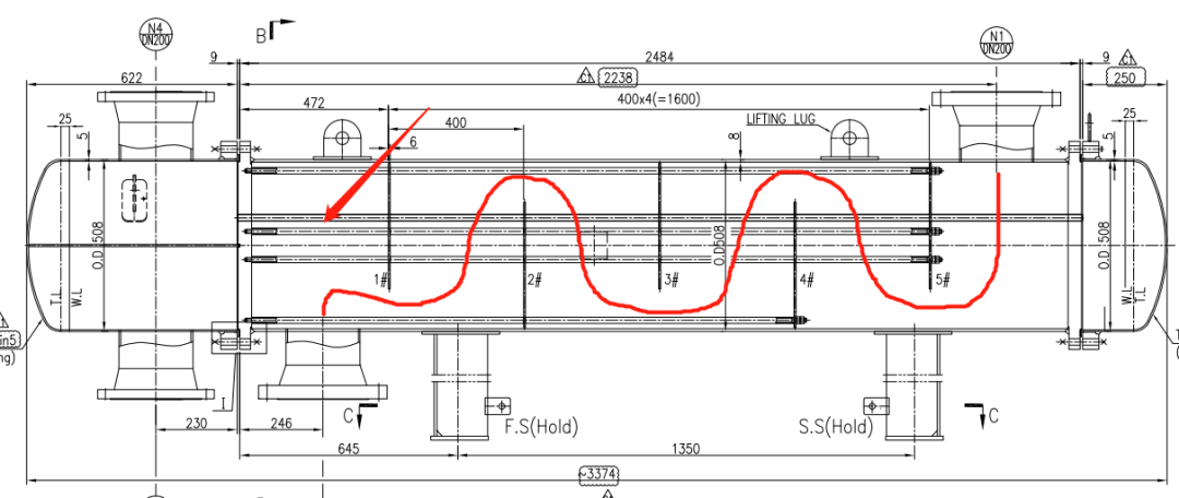 后面可能是被工艺老师傅点醒了,终于把折流板布置改了。