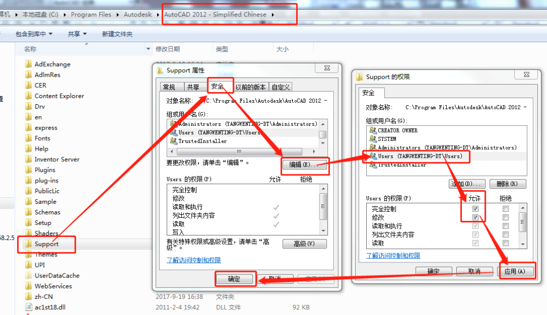 注意: 如果是Win10,无法取得管理员权限,那么点击VCAD文件夹,右键,属性安全,将权限设为完全控制修改都允许。 然后找到Autocad和VCAD文件夹,右键,属性安全,将权限设为完全控制修改都允许。
