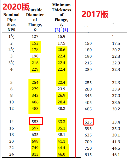 而且由于2020版本一些印刷错误,也可能导致加工出问题。 比如ASME B16.5, Class150,14”法兰的法兰盘外径,2020版本是553,而2017版本是535。正确的值应该是533(21*25.4=533.4)。 一旦做错,向谁说理呢?
