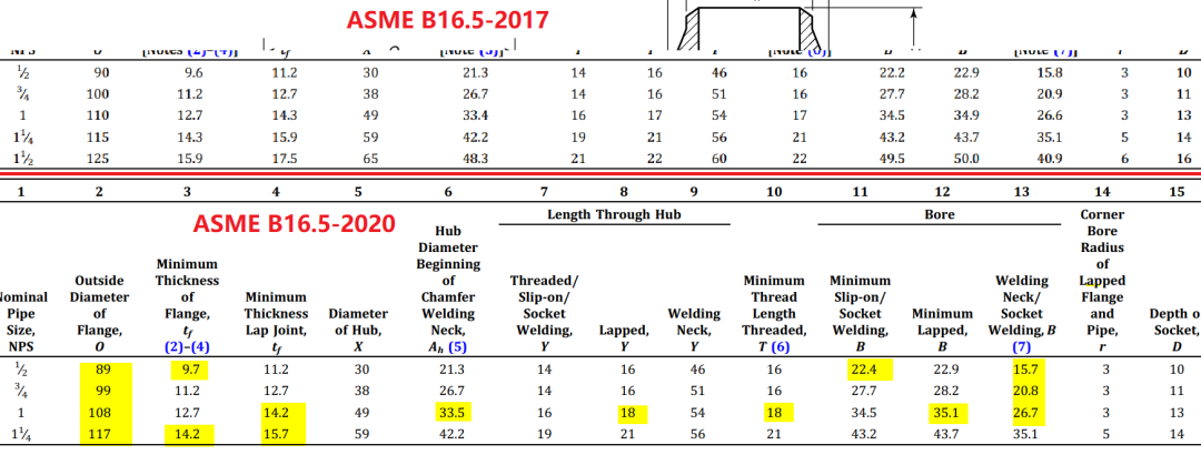2020版本的管法兰面临尺寸的修改,简直要把人折腾死。 公制版本法兰尺寸修改太多! 以前公制版本未严格按照英制*25.4转化,这次下了狠手,全部按照*25.4的尺寸来做公制版本。 比如原来法兰密封面高度是2mm和7mm,现在密封面高度是1.5mm和6.4mm。 只看Class150的几个法兰,下面图片对于修改过的尺寸用黄色背景标记。 从黄色的背景可以看出,几乎每个法兰都有尺寸的修改,虽然只是改动几毫米,但是尺寸的变化,造成的困扰一点没少。