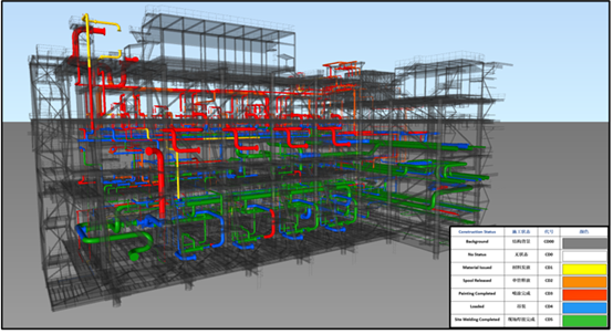 4D visualization is anther application with PCMS data. It is to match the piping spool data automatically in the model with those of the construction progress data from system, and mark the key milestones of the welding, release, painting, lifting and installation of each spool with different status color, so as to realize the visualization of piping progress.