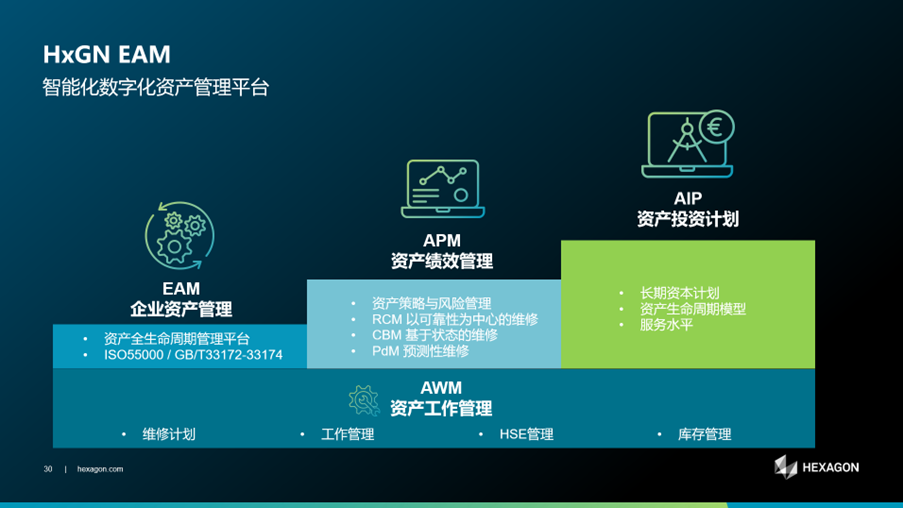 HxGN EAM核心功能不仅可以助力您实现资产管理,而且先进的插件模块和功能在结合行业最佳实践的基础上,为您优化维修战略。HxGN EAM可快速部署实施,为您的投资带来快速回报,其强大的移动平台确保运维目标的达成,实现可持续资产效率提升。