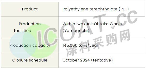 三井化学工业株式会社宣布,将于2024年10月(计划)关闭岩国大竹工厂的聚对苯二甲酸乙二酯(PET)工厂。该工厂PET产能为14.5 万吨/年。