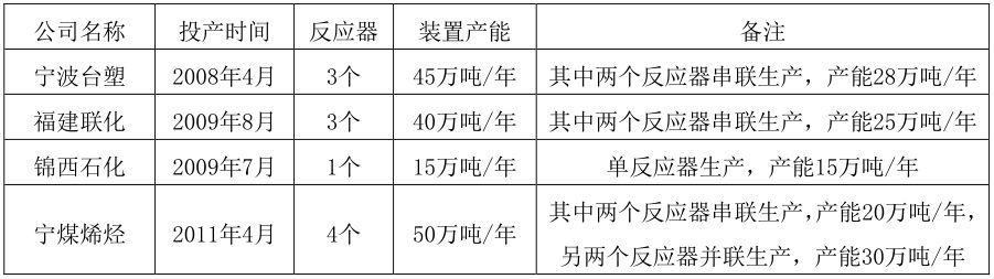 表一:国内Novolen工艺聚丙烯装置投产时间及反应器配置表