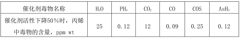 丙烯精制技术的工艺设计,取决于原料丙烯的质量。因为各装置的丙烯来源不同,所以其精制工艺的设计也不同。Novolen聚丙烯工艺中常见催化剂毒物对反应活性的影响如表二所示: