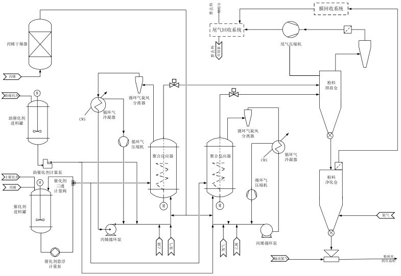 其它进料(三乙基铝、氢气等)与新鲜丙烯的进料成比例控制。第一个反应器生产的粉料间歇的压送至第二个反应器。对于抗冲共聚物,根据不同牌号的要求,第一个反应器生产均聚物,聚丙烯粉料及未反应的丙烯在压差作用下压送到第二反应器,第二反应器的操作压力比第一反应器低1.0MPa,以便于粉料的输送。第二个反应器加入乙烯和氢气(有些抗冲共聚牌号不需要加入氢气),另外第二反应器还要加入异丙醇来控制最终产品的乙烯含量及橡胶相的含量。