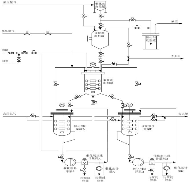 这三部分的操作通过三个独立的顺控程序控制图中所示的气动阀门(这些阀门中,有一部分受到两个顺控程序的控制)来完成催化剂的卸料、配制、计量和注入工作。Novolen聚丙烯工艺催化剂可以使用己烷、白油、丙烯来配制。使用不同配制介质,需要编制不同的顺控程序。