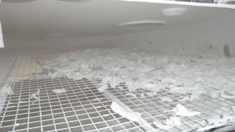挤压机粉进料斗料位频繁高报,是因为粉料夹带的片料在挤压机入口料斗的过滤网上积聚,导致音叉料位计触发。造成挤压机粉料料斗料位高报警的片料如图六中所示。