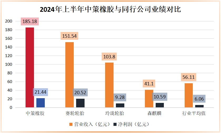 中策橡胶是国内最大的轮胎公司,2024年上半年,公司实现了185.18亿元的营收,超行业平均值230%;净利润达到了21.44亿,超行业平均值254%,两项均位列业内第一。