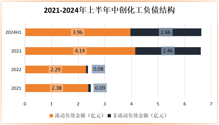 从负债结构看,虽然2021年至2024年上半年中创化工的流动负债呈现出较大增长,但相比之下还是非流动的负债的增长幅度更大,直接从0.09亿元增长到了2.66亿,相当于翻了30倍。