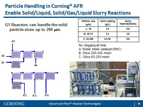 反应通道中的固体的行为是由颗粒,流体和反应器的表面之间的相互作用所控制,并且,如果适用的话,也可以考虑增加外部力量(如超声波)。康宁反应器可以管理这些复杂的相互作用,成功处理固体在实验室或规模生产。