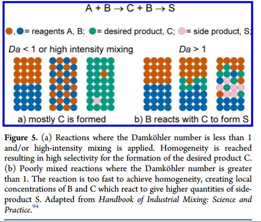这个无量纲单位是反应速率与扩散传质速率之比。对于Da小于1的反应,可以在反应发生前进行混合均匀(>95%)。然而,对于Da大于1的反应,反应速度大于传质速度,导致系统内局部产生浓度梯度。
