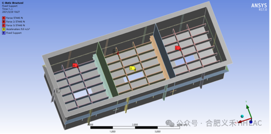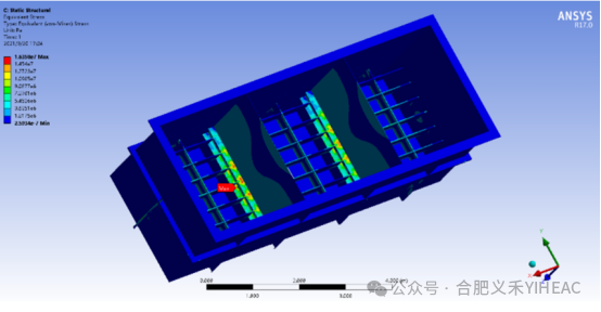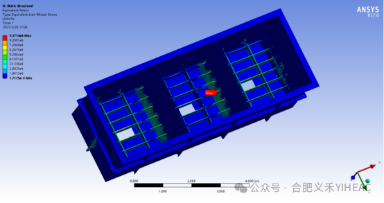 根据实际工况在蓄热室内部每个填料支撑结构上表面都施加垂直向下的稳态载荷,此载荷模拟现实情况陶瓷的重量,每个腔室填充的陶瓷体积为2.1*1.8*1.4m,陶瓷的密度大约为1000kg/m3,同时考虑支撑结构的自重,故每个腔室施加载荷大小为57446N。对箱体底部施加固定约束,如图3所示。 1.4结果分析HAPPY NEW YEAR