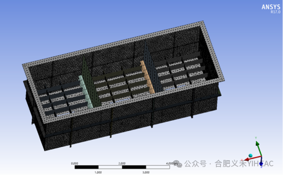 进入ANSYS Workbench界面,加载Static Structural 模块对RTO蓄热室进行静态力学稳态分析。前处理阶段包括材料属性定义、建立模型、网格划分以及施加边界条件及载荷。 1.2.1 蓄热室的材料属性及划分网格 蓄热室箱体外壳、强筋及横梁使用Q235B碳钢材料,蓄热陶瓷格栅及支撑结构采用2205双相不锈钢材料。在Engineering Data新建这两种材料的属性。在Geometry加载蓄热室三维模型。进入Static Structural-Mechanical 模块进行网格划分。选择AutomaticMethod划分方法,指定合适的划分尺寸,对箱体外壳及填料支撑结构进行网格划分,如图2所示。 1.3 边界条件和载荷HAPPY NEW YEAR