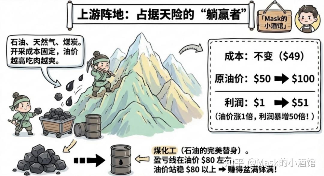 听起来化工行业全都会大赚特赚,但实际情况远没有这么简单。 化工可以简单分成上游、中游和下游三部分。不同位置的企业,面对油价上涨的反应完全不一样。 上游主要是石油、天然气、煤炭这些基础资源。原油涨价对上游来说是直接利好。因为他们的开采成本基本没怎么变。举个最简单的例子:假如开采一桶油成本是49美元,原来卖50美元,利润只有1美元。可要是油价涨到100美元,利润就变成51美元。油价只涨了50美元,利润却暴增50倍! 而且国内还有煤化工这个石油的“替代方案”。有些产品比如烯烃、乙二醇,既能用石油做,也能用煤做。煤化工的盈亏平衡点大概在油价80美元左右。只要油价站稳80美元以上,这些企业就能赚得盆满钵满。