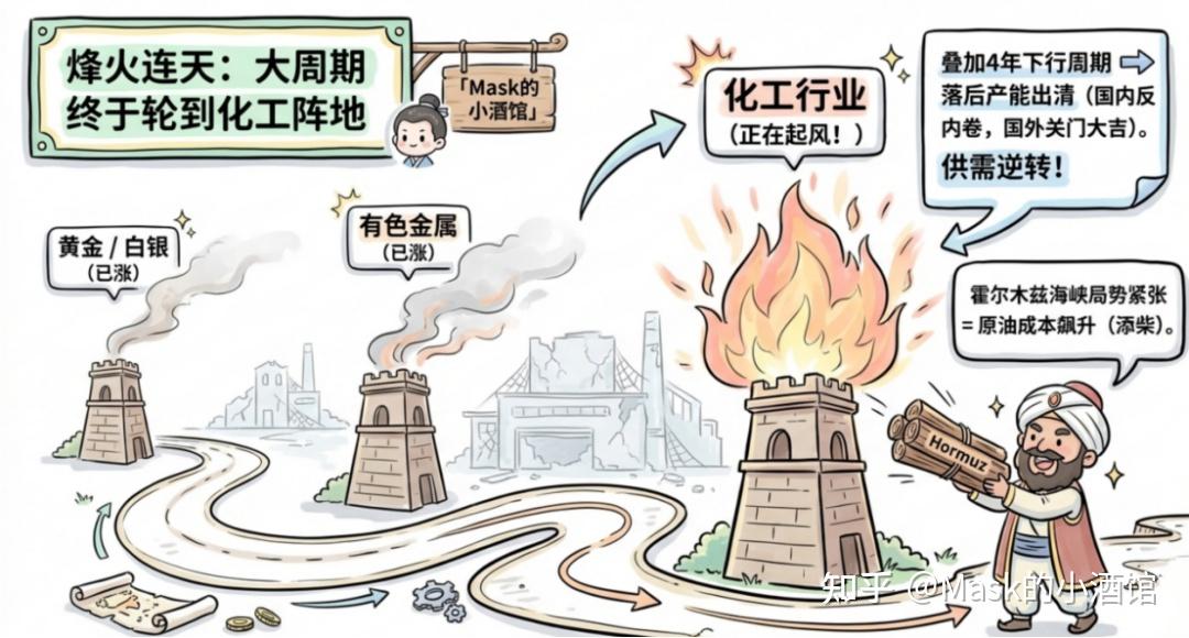 但问题来了,美元超发了这么多,但是全球的实物不可能凭空变出来这么多。钱多货少,那么钱就会贬值,货物就会涨价。 这个逻辑是不是特别好懂?所以你看,之前黄金、白银、有色金属先涨起来了。现在,这个逻辑轮到化工身上了。 从2022年开始,化工行业连续走了四年下行周期。不少企业亏得一塌糊涂,有的直接破产倒闭。国内现在在反内卷,出清落后产能;国外很多化工厂干脆关门大吉。产能少了,但市场需求还在,化工产品价格自然就得涨。 更巧的是,最近霍尔木兹海峡那边局势紧张,直接推高了国际原油价格。化工行业一大块成本就来自原油,这一下,化工产品的价格又被进一步抬了起来。