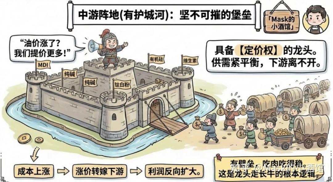 上游的企业,在这个周期里基本是躺着也能吃肉的类型。油价涨得越高,他们笑得越开心。 中游才是分化最严重的地方。这里大家买原料、加工、卖产品的流程差不多,成本端也差不多——油价涨大家都涨,煤价涨大家都涨,水电运费也差不多。可关键来了:能不能把涨价转嫁给下游,完全看命。 中游其实分成两种完全不同的生意。 第一种是有定价权的:全国就那么几个玩家,新产能很难批、很难建,供需长期紧平衡,下游离不开你。代表产品有MDI、纯碱、钛白粉、有机硅、维生素这些。