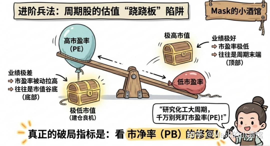 那普通人怎么办呢?其实研究化工,不能光看市盈率,得看市净率。 为什么?因为周期行业有个特点:业绩改善的时候,市值越高,市盈率反而可能越低。市盈率高的时候,往往是市值低点;市盈率低的时候,才是市值高点。