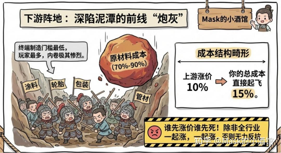 所以在中游,看的不是油价高低,而是看壁垒。有壁垒的企业吃肉,没壁垒的企业只能吃土。 下游就更受伤了。涂料、塑料、轮胎、胶粘剂、包装、印染、普通管材这些,都属于下游。他们的成本结构里,原材料占了70%到90%,人工、制造、运费只占一小点。上游一涨价,他们的成本直接被抬上天。油价涨10%,他们的成本可能就涨15%。