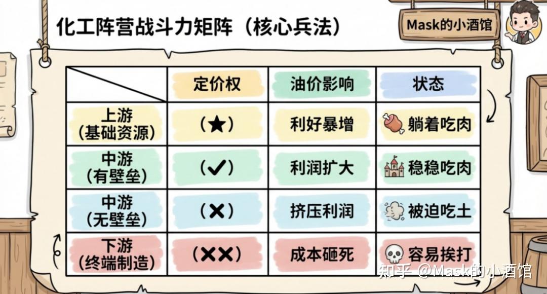 更要命的是,下游行业门槛低,玩家多,产品同质化,竞争惨烈。你敢涨价吗?客户马上找别家。不敢涨,也涨不动。除非全行业一起涨,否则谁先涨谁先破产。 所以油价上涨,并不是所有化工企业都受益。一般是上游吃肉,中游看壁垒,下游容易挨打。上游和有壁垒的中游公司,才有更好的安全边际。