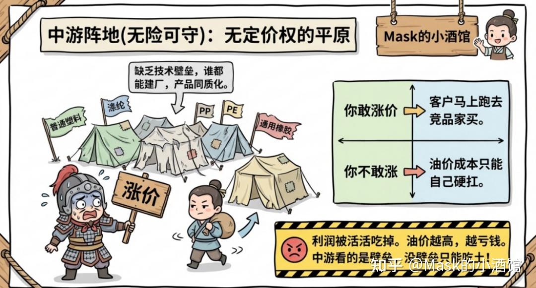 油价涨了怎么办?他们不但能跟着涨,甚至能涨得更多。成本涨了,利润不但没被压缩,反而扩大了。这就是某些龙头公司能走长牛的根本逻辑——有壁垒,吃肉吃得稳稳的。 第二种是没定价权的:比如普通塑料、涤纶、PP、PE、通用橡胶等等,他们谁都能建厂,产品没什么技术壁垒。你一涨价,客户马上跑去别家买。结果呢?油价涨→成本涨→不敢涨价→利润被活活吃掉。油价越高,越亏钱。
