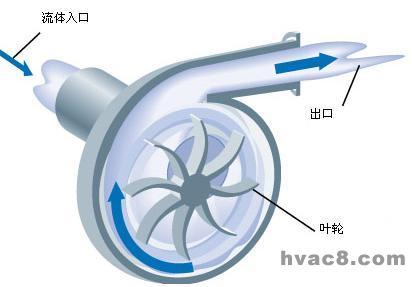 分类 | 离心式 | 轴流式 | 混流式 | 贯流式 | 基本原理 | 叶轮高速旋转时产生的离心力使流体获得能量 | 旋转叶片的挤压推进力使流体获得能量,升高其压能和动能 | 离心式和轴流式的混合体 | 原理同离心式 | 结构演示 | 做功部件 | 整体结构 | 做功部件 | 整体结构 | 做功部件 | | 做功部件 | 整体结构 | | | | | 见后一节(略) | 见后一节(略) | 产品例证 | 中央空调用离心风机 | 中央空调或冷库用轴流式送水泵 | 混流送水泵 | 家用空调室内风机 |