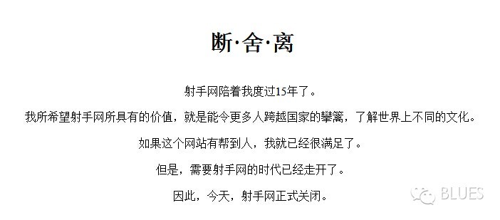 射手网陪着我度过15年了。 我所希望射手网所具有的价值,就是能令更多人跨越国家的攀篱,了解世界上不同的文化。 如果这个网站有帮到人,我就已经很满足了。 但是,需要射手网的时代已经走开了。 因此,今天,射手网正式关闭。