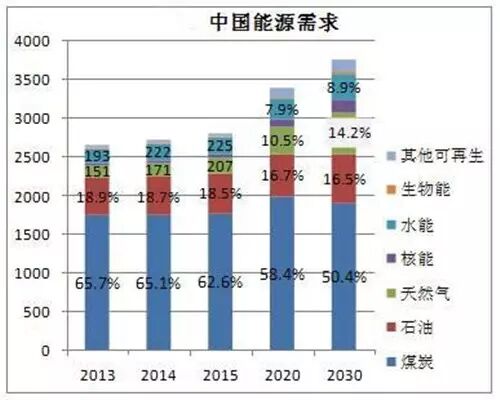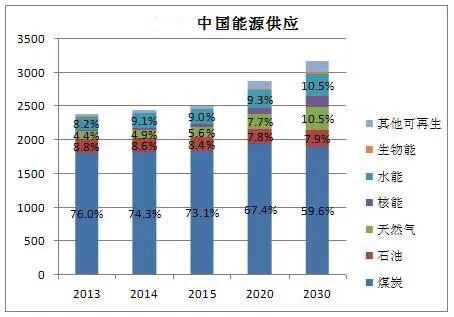 中国对可再生能源的供应逐年上升,但仍供不应求,天然气在能源结构中比例增加最为明显。到2030年将上升至能源供应的10.5%。