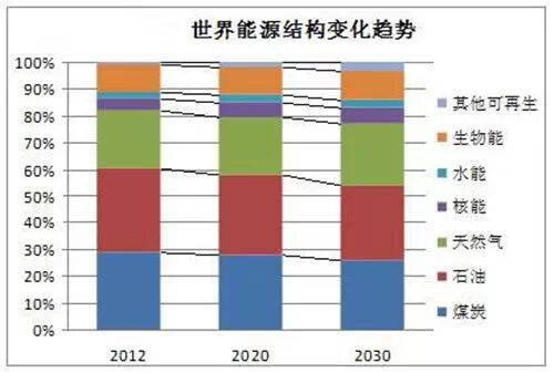到2030年,天然气、核能和可再生能源合计比重从2012年近40%提高到46%,预示全球能源结构优化和转型趋势。