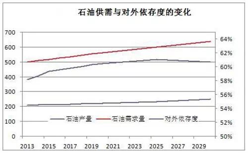 2030年石油需求和供应量分别为6.36亿吨和2.5亿吨(也有9.36亿吨需求的预测)。