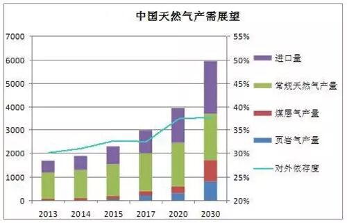 图7:2020年前中国天然气需求保持双位数增长,天然气需求占比从5%稳升至10%,天然气供应增长动力来自非常规和进口。对外依存度稳定在37%左右。